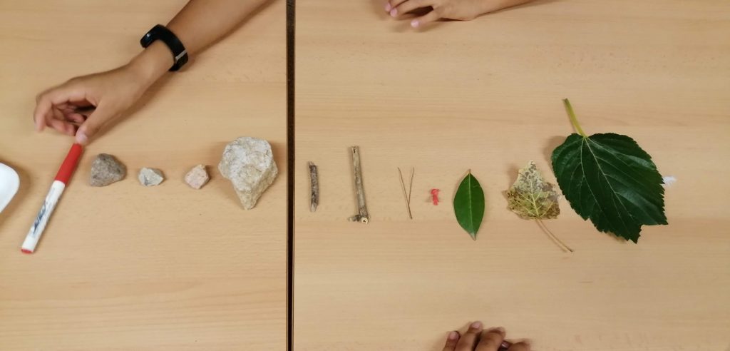 Ens hem organitzat per grups de treball. Hem recollit objectes del pati i els hem classificat segons els següents criteris: