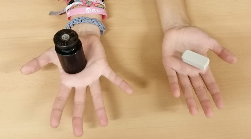 Amb aquest grup hem intentat endevinar les propietats físiques d’alguns objectes sense fer servir la vista. Només podíem utilitzar els sentits del tacte i de l’oïda.