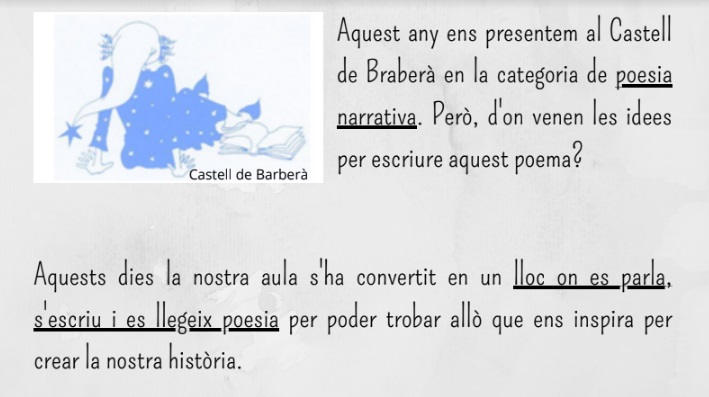 El mes de febrer ha estat un mes inspirador.  La Fira poètica que els infants s’han trobat a l’aula els ha facilitat trobar distintes fonts d’inspiració per a la creació de la història que utilitzaran en el seu poema narratiu per al concurs literàri del Castell de Barberà. Cada infant tenia un quadern escriptor per anotar aquelles sensacions, impressions i idees. Una primera planificació, un primer contacte amb el full en blanc…