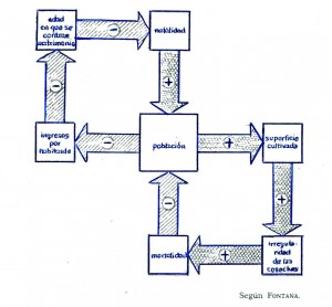 Un modelo gráfico muy sencillo puede ayudar a explicar la forma en que actuaban los dos principales mecanismos de ajuste de la población en la era preindustrial. La acción discurre en el sentido de las flechas, y el signo que lleva cada una de éstas significa lo siguiente: el signo +, que la relación existente entre el factor de donde arranca la flecha y aquél al que se dirige es directa (cuando aumenta el primero, aumenta también el segundo, y cuando disminuye el primero, lo hace igualmente el otro); y signo -, que la relación es inversa (cuando aumenta el primero, disminuye el segundo, y cuando disminuye aquél, aumenta éste). De los dos circuitos, el más importante es el que actúa a través de la mortalidad. Su acción puede explicarse brevemente así: cuando la población aumenta, hay que roturar nuevas tierras para alimentar las nuevas bocas. Esta ampliación del cultivo significa que hay que utilizar tierras de inferior calidad, puesto que se supone que las mejores son las que se han roturado en primer lugar. Sembrar estas tierras marginales es aumentar el riesgo de que cualquier circunstancia adversa (y ante todo una meteorología desfavorable) arruine las cosechas, con lo cual aumenta paralelamente el peligro de que, perdida parte de la cosecha, se desencadene la sucesión de hambre y epidemia que conduce a una mayor mortalidad y a disminuir la población a un nivel que permita prescindir de las peligrosas tierras marginales.