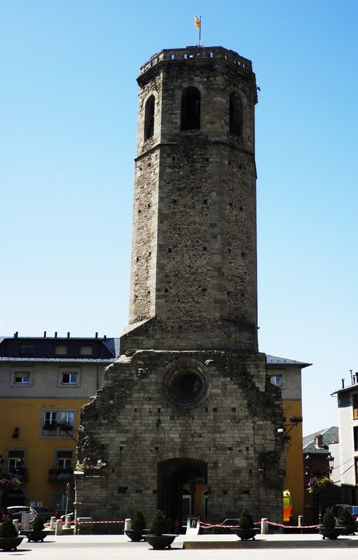 L’antiga església parroquial de Santa Maria fou començada a construir a partir de 1177, data de la carta de concessió per repoblar el Pòdium ceretani, raó per la qual integrava elements propis del romànic, per bé que majoritàriament fos d’estil gòtic. A l’inici de la Guerra Civil Espanyola i sota el comandament de la CNT-FAI, el 1936 es va dur a terme el seu desmantellament, fet a pic i pala, i només restà dempeus el campanar, per raons utilitàries, el qual avui dia presideix la plaça d’igual nom.
