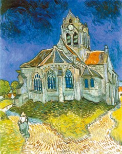 ¿Una iglesia rural? Sí, y concretamente la de Auvers-sur-Oise. He aquí la fotografía y el cuadro. Las semejanzas son patentes, sin que pueda uno confundirse acerca del lugar ni acerca del modelo. El pintor se ha situado a alguna distancia de la cabecera del templo. Se han respetado los diferentes cuerpos del edificio; el campanario, los brazos del crucero, a la derecha la absidiola, los contrafuertes, de los cuales el de la izquierda, visto de perfil, forma una poderosa masa. También se ha respetado el número y clase de las ventanas, góticas en el ábside y en la torre, románicas en la absidiola. Los elementos del edificio no son menos reconocibles: se adivina la nave entre el ábside y el crucero, los faldones del tejado cubren los brazos de cruz, el campanario ostenta su reloj entre el piñón y los dos huecos. Todo está, hasta los detalles de las vidrieras. Ante la iglesia hay el mismo entrante del prado triangular, con la bifurcación del camino. Detrás descubre el cielo la misma inmensidad. La fotografía no nos muestra los árboles de la izquierda ni la casita de la derecha. También está ausente la mujer que sube por el camino. Aparte de estos detalles, el cuadro es de una exactitud, si no fotográfica, al menos, insistamos en ello, topográfica. Dígase lo que se quiera de Van Gogh, que salía de un asilo de alienados, que sus crisis se reproducían, que iba a suicidarse poco después, no se puede negar al artista, sin embargo, haber tenido la voluntad de pintar lo que tenía ante los ojos. El rigor de su observación da fe de ello.