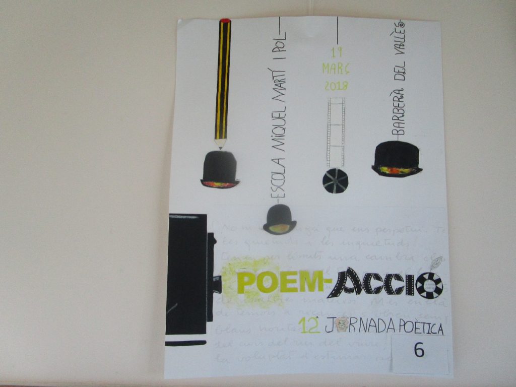 També cada classe ha de fer un cartell per anunciar la jornada poètica, al cartell ha de sortir alguna cosa que representi poema i una altra que representi acció i dades com el dia de la jornada poètica, la ciutat, etc. Nosaltres vam posar uns focus enfocant el títol que és poem-acció. Però abans de fer el cartell vam fer un esquema per guiar-nos una mica, el següent pas va ser que cadascú fes un cartell individualment, després vam exposar les idees a la classe vam fer 8 grups de 4 alumnes de 5èC per fer cada grup un cartell i d’allà agafarem idees per fer el cartell definitiu. Però abans de començar havíem de planificar qui farà cada cosa i quan tot estava planificat ens vam posar a fer el cartell. Després quan tots han entregat el cartell el jurat ha de votar quin és el millor cartell i aquest any ha guanyat 6èB.