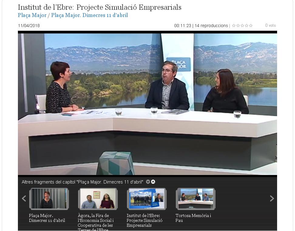 El dimecres 11 d’abril els alumnes del CFGS d’Administració i Finances, Cristina Escoda i Roger Muñoz, acompanyats dels professors Ferran Sabaté i Lara Melich, visitem el plató del Canal Terres de l’Ebre. En el programa Plaça Major, que s’emet en directe, expliquem el projecte educatiu de l’empresa simulada i la visita a la Fira Internacional d’empreses simulades a Busel·les, dins del marc del projecte de Mobilitat Internacional del centre.
