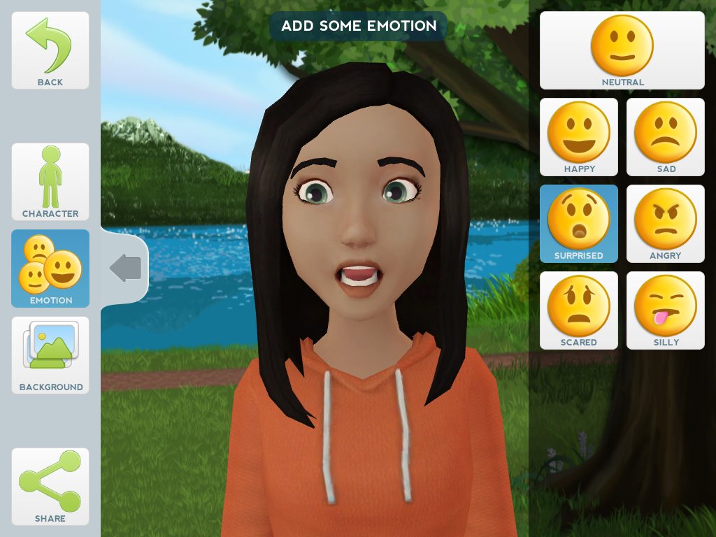 Descripció: L’aplicació possibilita la creació de petites escenes audiovisuals amb personatges animats (avatars) i entorns personalitzables per a compartir (via xarxes socials o via missatgeria) en un format de vídeo (mp4) fàcilment exportable i usable en altres dispositius digitals.