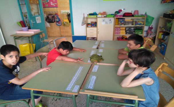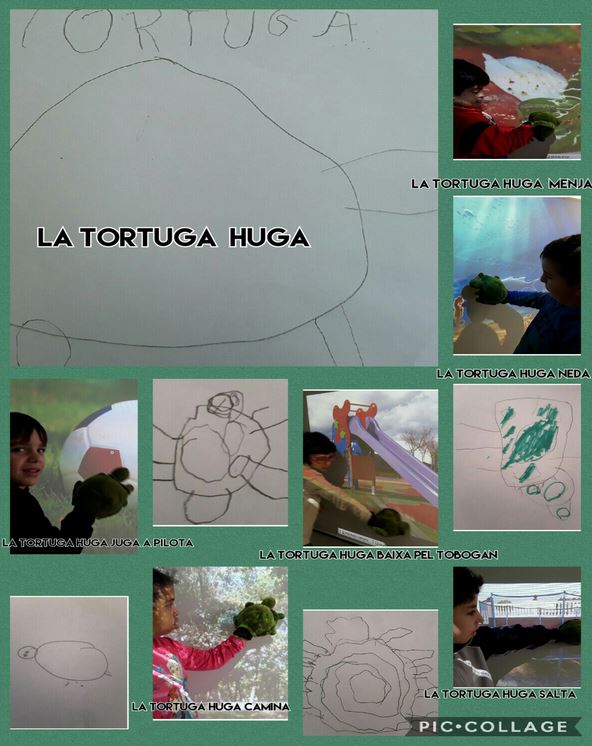 La tortuga Huga forma part de la nostra aula, és la nostra tortuga i marxa amb els alumnes a casa els caps de setmana. (Era una manera de promoure la comunicació que no va tenir els resultats que preteníem per diversos motius) També ha vingut a les sortides, a algunes festes…. Forma part del nostre dia a dia escolar i a més ens ajuda en moments de crisis. També ha estat el tema d’un dels centres d’interès que hem treballat (les tortugues).