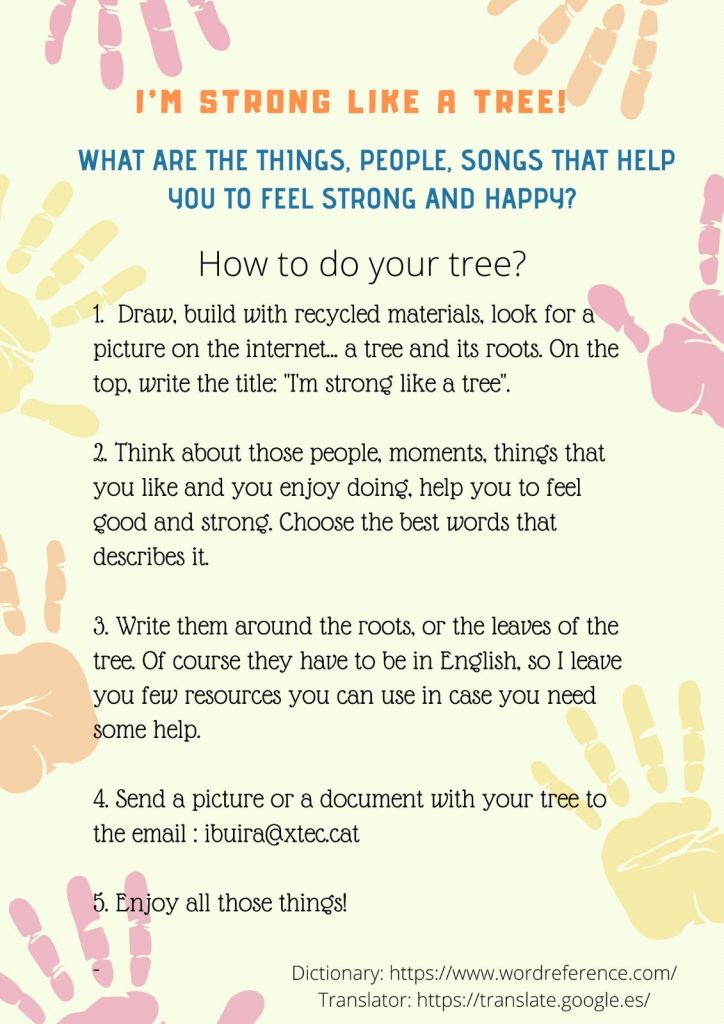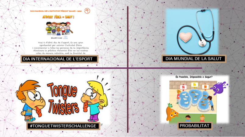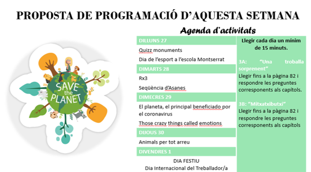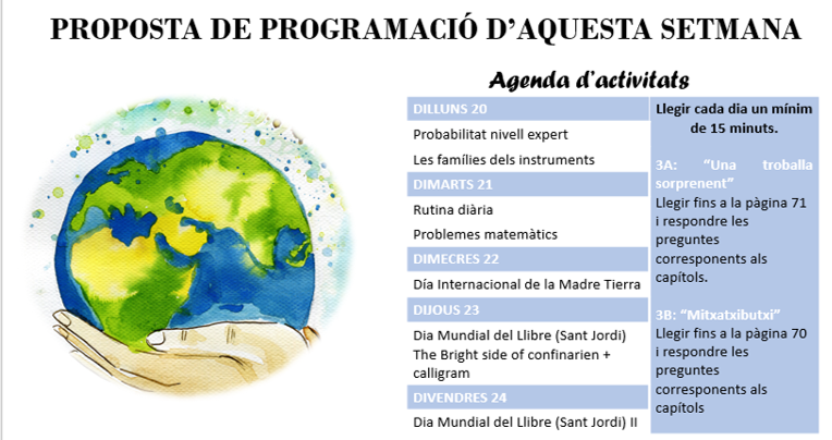 Com ja sabeu, d’ara endavant les propostes seran setmanals. A continuació us deixem un petit resum de les diferents activitats. Al vostre correu electrònic teniu les instruccions de la setmana. De cara a facilitar la feina, hem creat una carpeta al drive anomenada “Setmana 20-24 d’abril” on podeu veure tots els fitxers.