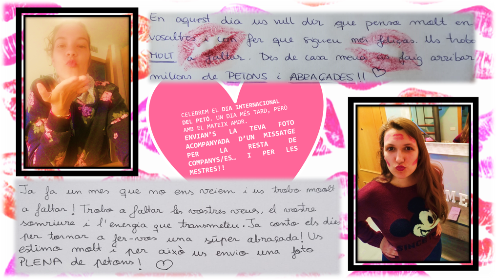 * Dia internacional del petó: ahir va ser el dia internacional del petó i ho volem celebrar. Envian’s la teva foto acompanyada d’un missatge per la resta de companys/es… i per les mestres!