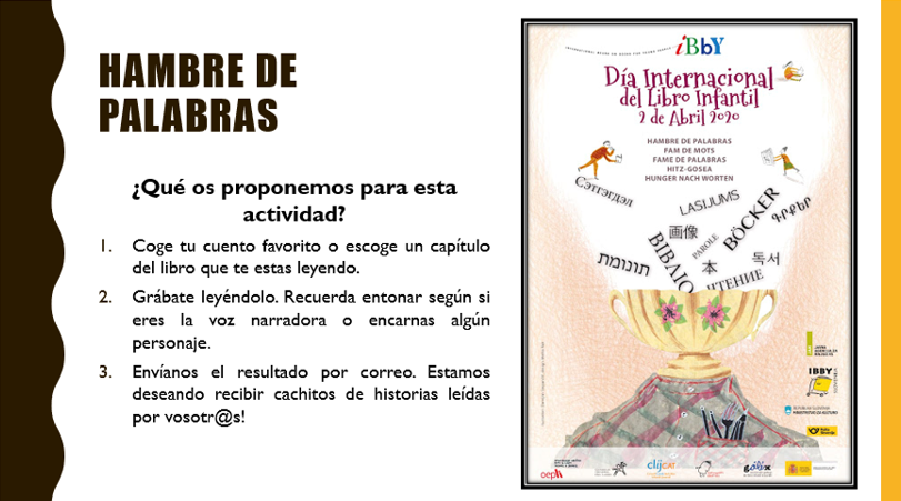 Per altra part, us expliquem que avui és el Dia Internacional del Llibre Infantil i Juvenil. Aqui teniu una petita explicació però consulteu el vostre correu electrònic per trobar informació ampliada de l’activitat.
