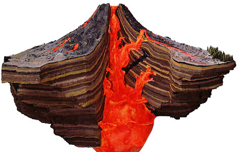 La lava i els altres materials que expulsa el volcà s’acumulen al voltant de l’orifici de sortida i formen una mena de turó que rep el nom de con volcànic. Secció esquemàtica de l’interior d’un volcà