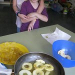 3.    Passa les rodanxes de poma per la pasta  i amb l’ajut d’un adult els fregiu en una paella amb oli abundant i ben calent.Posa les rodanxes a sobre d’un plat on hi hagi un paper de cuina perquè absorbeixi l’oli i empolsa-les amb una mica més de sucre.