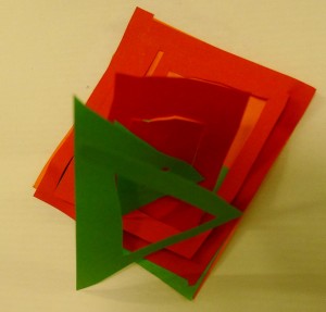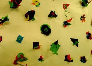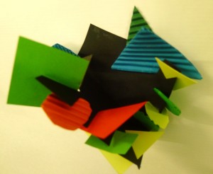 A la propera sessió canviarem els fulls (reciclats) per retalls de papers i cartolines de sessions anteriors i amb l’ajut d’unes tisores retallarem formes per a crear volum.