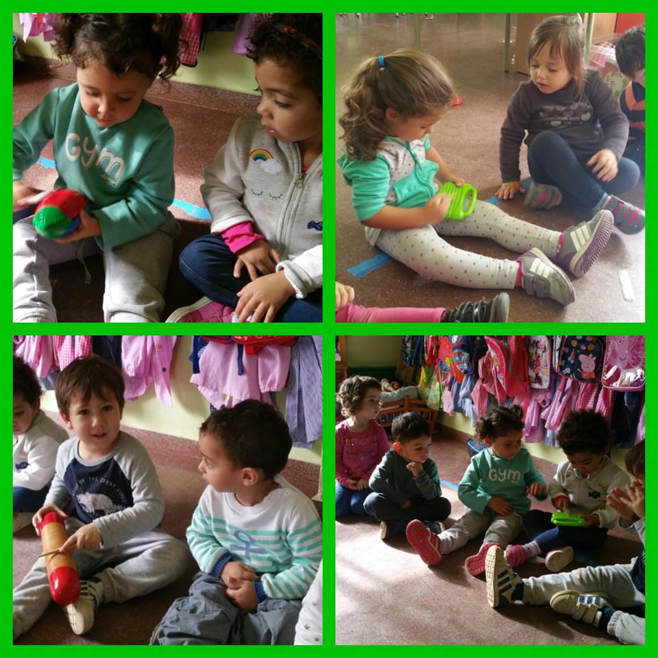 A través de la motricitat global s’arriba a l’educació musical utilitzant material com pilotes, cintes, pentagrames al terra, mocadors… i petita percussió com panderos, pals, cròtals…