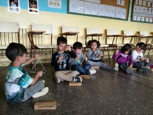 No és fàcil tocar els instruments amb les baquetes així que hem estat practicant i ens ha agradat molt.