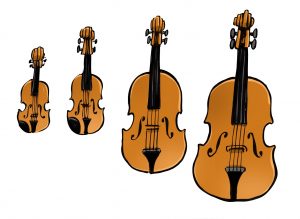 Presentem els instruments de la família de la corda observant les seves fotografies i escoltant els seus sons. Els presentem ordenats per la seva grandària i l’associem a la seves altures de sons; de gran i greu a petit i agut –contrabaix, violoncel, viola i violí-.