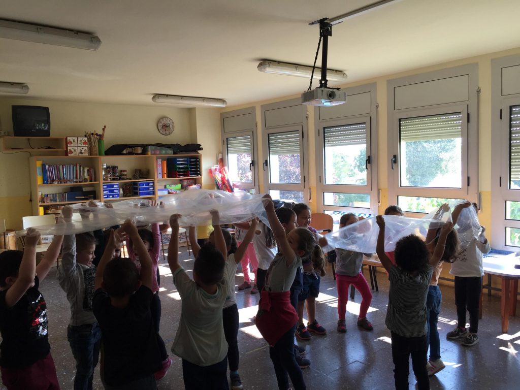 Aquí, per parelles, i units per una pilota, ballem seguint la música amb tot el cos i intentant coordinar amb el company.