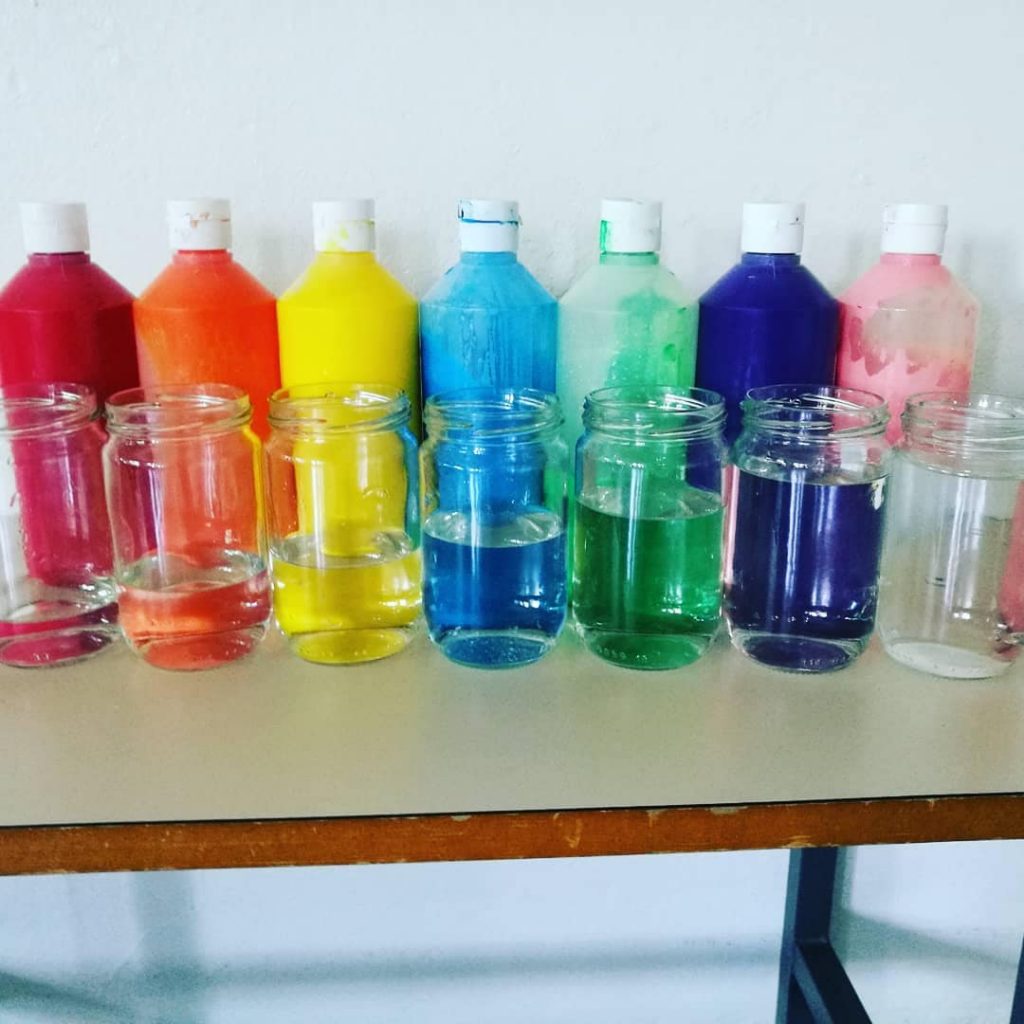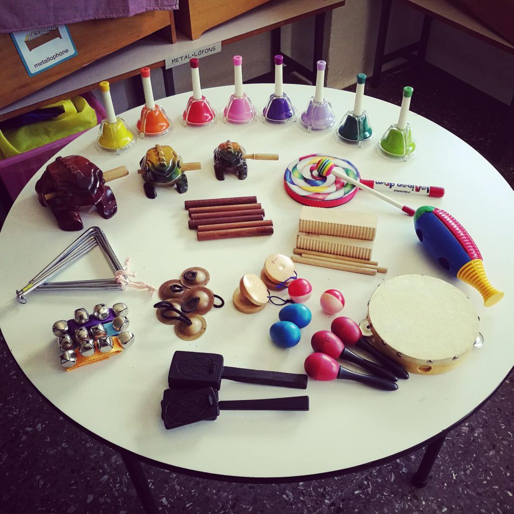 Al taller de plàstica de cicle superior construïm diversos instruments amb materials que podem trobar a casa… Un pal de pluja fet amb un rotlle de paper de cuina ple d’arròs o altres materials, unes maraques fetes amb petits recipients, un xiulet fet amb dos pals de gelat i una canyeta o aquest xilòfon fet amb gots d’aigua.