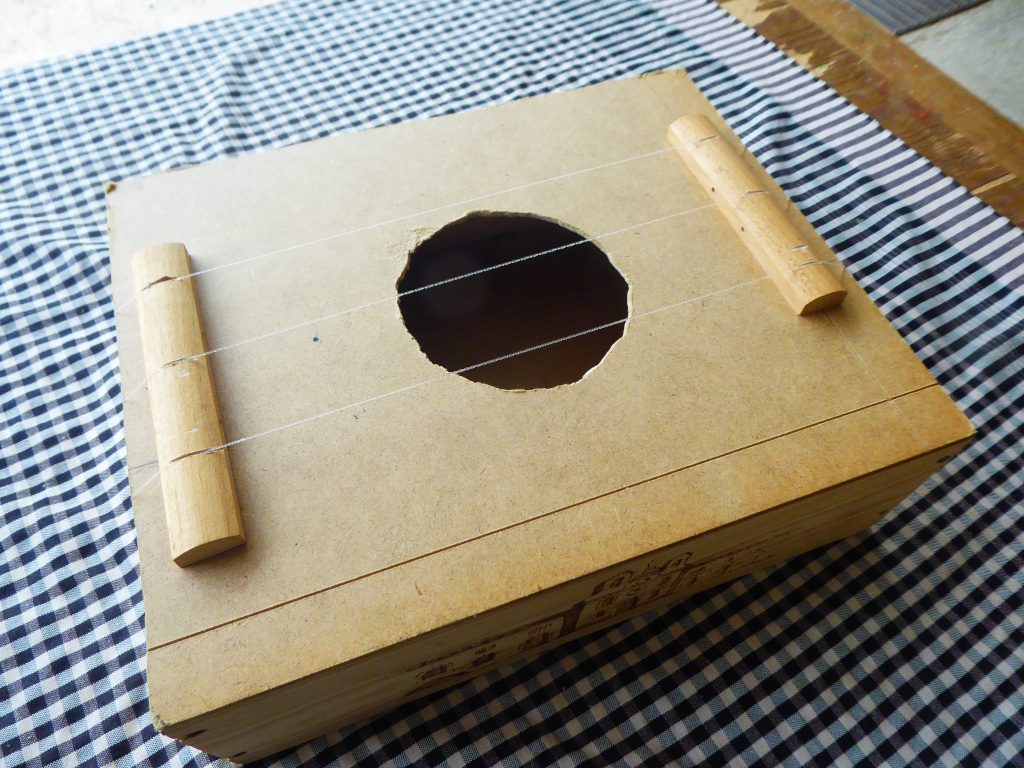 Vaig començar fent un forat al mig de la fullola amb una serra de marqueteria i quan vaig acabar el forat vaig enganxar la fullola a la caixa de vi. Després vaig posar el fil de pescar lligat a la clau hexagonal i per afinar-ho has d’anar girant la clau hexagonal i així s’afinarà i farà que soni. Per últim vaig posar les fustes petites com si fossin els ponts del meu HUGELELE.