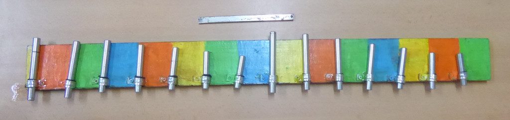 Vaig començar per agafar uns ferros que vaig trobar en un caixó, desprès li vaig demanar en en Dídac, un ferrer, que em tallés els ferros a una mida que li vaig donar. Això va facilitar gran part del meu treball. Després vaig agafar un tros ben llarg de fusta i unes pecetes de ferro per assegurar que els pals de ferro no és moguessin de lloc, però després vaig veure que que els ferros eren massa prims i hi vaig posar una goma adhesiva negra perquè ho fes més gruixut de manera que feia que no es bellugués. Per acabar va tocar fer l’embelliment, amb la qual cosa que no vaig ser massa curós. Vaig pintar els laterals i les arestes de negre i per cada separació combinava el blau, taronja, groc i verd.