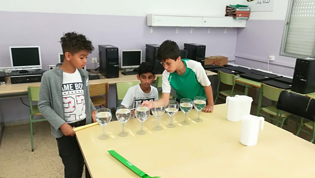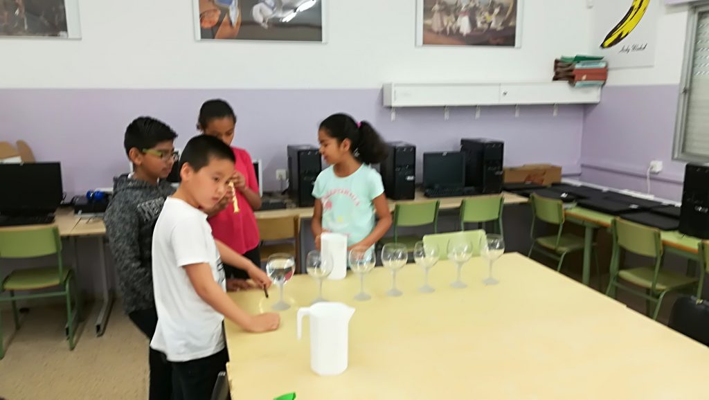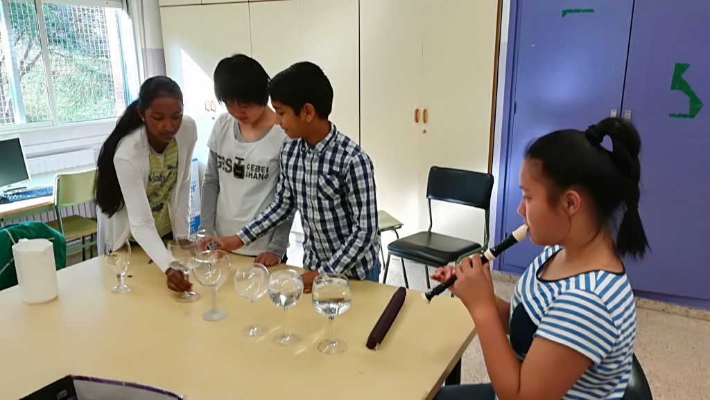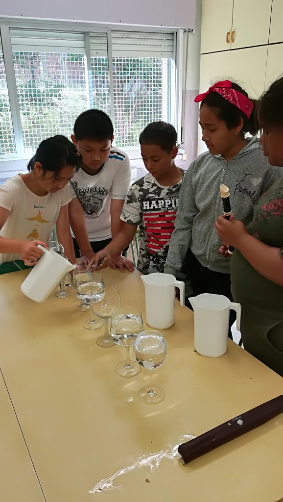 Es tracta de experimentar amb els 7 sons de l´escala musical, a partir de la nota de la flauta , creant-los amb aigua i set copes de vidre.