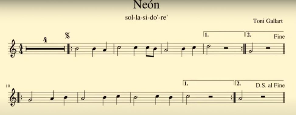 Partitura amb 5 notes diferents: sol, la, si, do’ i re’