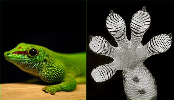 - Els gecònids presenten una peculiar característica: les seves potes presenten microestructures que els permeten reptar per les parets sense caure, inclús per vidres. La nanotecnologia, basant-se en aquest tipus d’animal, ha tret diferents materials adhesius, a partir de columnes de poliuretà amb una punta plana, de manera que pocs centímetres quadrats poden supertar centenars de quilos.