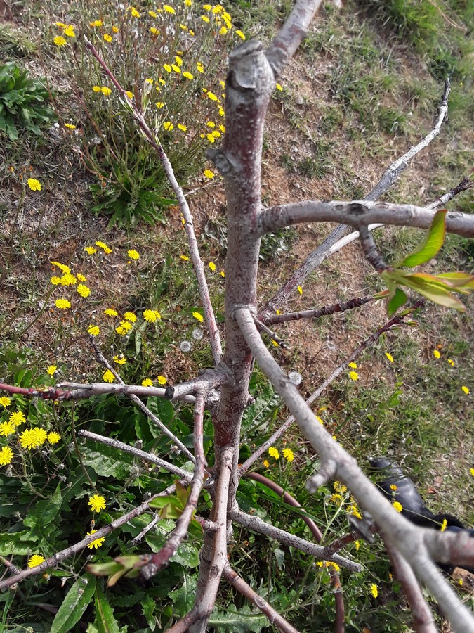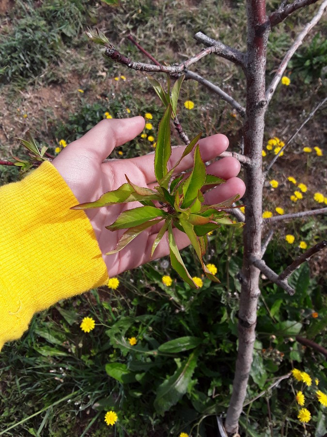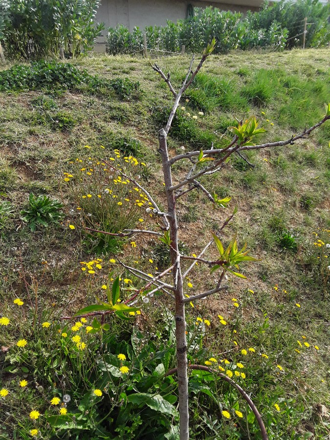 The fruit is a variety of a peach, it has a flattened shape. The flowers are pinkish.