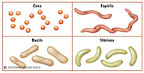 Quatre formes bàsiques de bacteris: cocs, bacils, espirils i vibrions.
