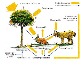 Tot això fa que la quantitat total de matèria i energia que hi ha en un determinat nivell tròfic sigui molt menor que la que s’acumula en el nivell tròfic següent. En cada baula o nivell tròfic d’una cadena alimentària, s’origina una pèrdua de matèria i energia, les quals, per tant, van disminuint al llarg d’aquesta cadena.