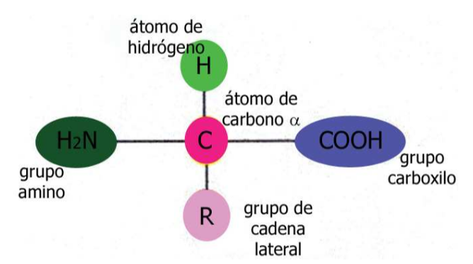 Tots els aminoàcids, menys un, anomenat glicina, presenten el carboni alfa asimètric, ja que està enllaçat a quatre radicals diferents: un grup amino, un grup carboxil, un radical R i un hidrogen.