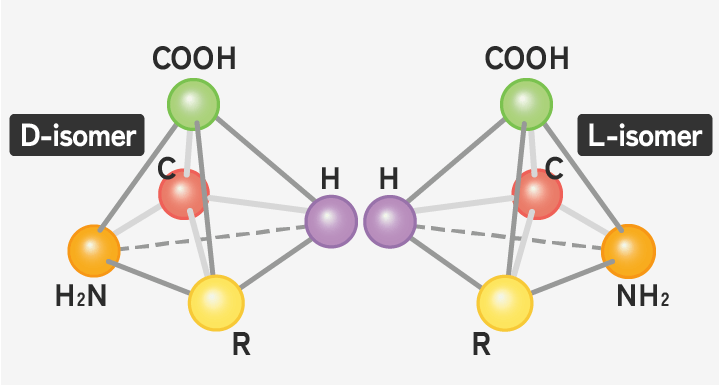 Un aminoàcid té una configuració D si, quan es disposa en l’espai de manera que el grup carboxil quedi a dalt, el grup NH2 queda situat a la dreta, mentre que, si es troba a l’esquerra, té una configuració L.