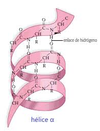 - L’hèlix alfa. Es forma quan l’estructura primària s’enrotlla helicoïdalment sobre si mateixa. Això és degut a la formació d’enllaços d’hidrogen entre l’oxigen del CO- d’un