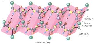 - La conformació beta o làmina beta. En la conformació els aminoàcids no formen una hèlix, sinó una cadena estesa en forma de zig-zag, a causa de la manca d’enllaços d’hidrogen entre els aminoàcids pròxims. Si la cadena amb conformació es replega, es poden establir enllaços d’hidrogen entre els segments, abans distants, que ara han quedat propers. Això dóna lloc a una làmina en ziga-zaga, molt estable, anomenada làmina plegada.
