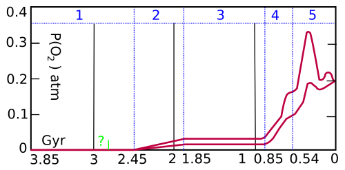 Oxigen molecular a l’atmosfera de la Terra donat en atmosferes de pressió. Etapa 1 (3850-2450 milions d’anys): no s’hi acumula dioxigen. Etapa 2 (2450-1850 m. a.): el dioxigen és absorbit pels oceans i fons marins. Etapa 3 (1850-850 ma): el dioxigen surt de l’oceà i és absorbit per la superfície terrestre i en la formació de la capa d’ozó. Etapes 4 (850-540 m. a.) i 5 (540 fins a l’actualitat): el dioxigen s’acumula a l’atmosfera. Font: Wikipedia