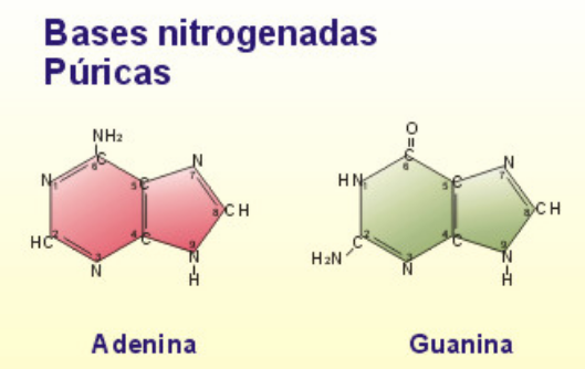 * Bases púriques: derivades de la purina, molècula constituïda per dos cicles o anells. Són l’adenina (A) i la guanina (G).