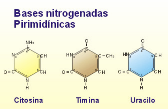 * Bases pirimidíniques: derivades de la pirimidina, molècula amb un únic cicle. Són la timina (T), uracil (U) i la citosina (C)