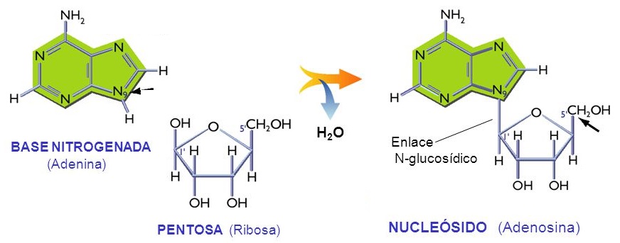 Els nucleòsids es formen per mitjà de la unió d’una ribosa o d’una desoxiribosa amb una base nitrogenada, mitjançant un enllaç N-glicosídic entre el carboni 1’ de la pentosa i el nitrogen 1’ de la base nitrogenada, si aquesta és pirimidínica, o el nitrogen 9, si és una base púrica.