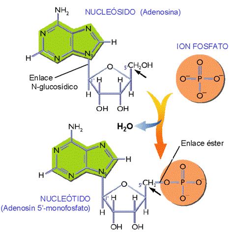 Aquesta unió es dona entre el grup hidroxil del C5 de la pentosa mitjançant enllaç èster amb pèrdua d’una molècula d’aigua.