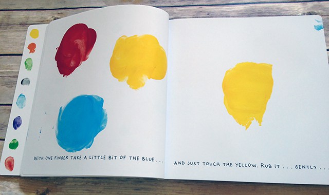 La lectura del llibre avança a partir de les propostes al lector d’experimentació amb les mans per fer aparèixer colors o barrejar-ne. Els resultats, a la pàgina següent.