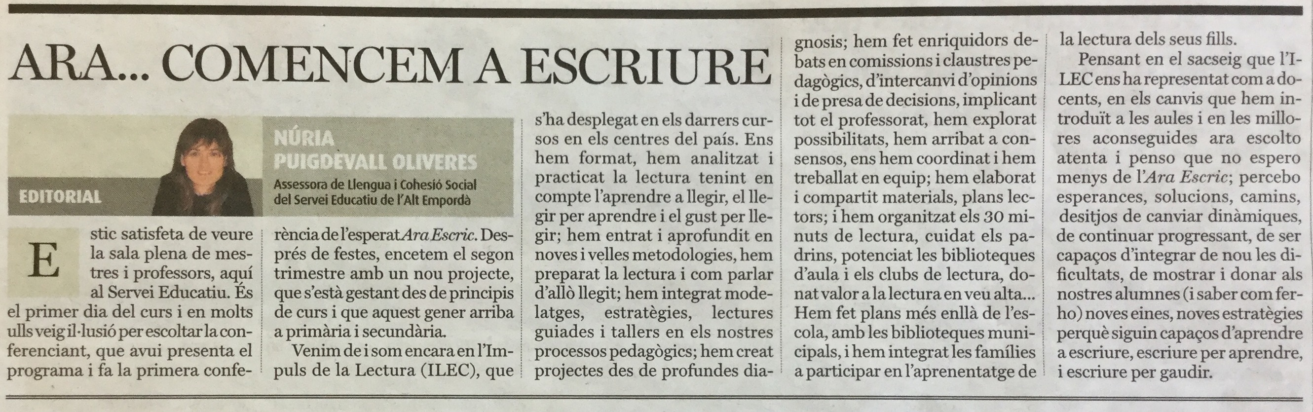 t mes de gener s’inicia a tot el territori la formació al professorat sobre l’Ara Escric. A la comarca de l’Alt Empordà el Servei Educatiu organitza dos cursos, un per al professorat de Cicle Infantil i Inicial, i un altre per al de Cicle Mitjà i Cicle Superior. El curs per al professorat de Secundària de la comarca es durà a terme al Servei Educatiu del Gironès.