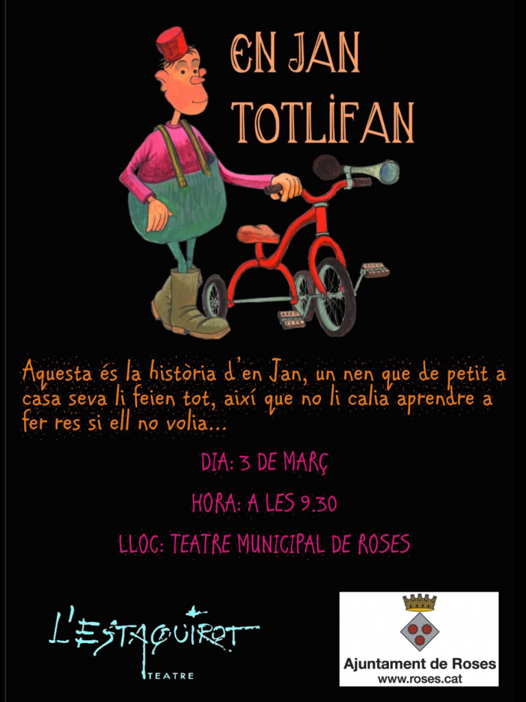 Aquesta setmana molts alumnes de les escoles de la comarca aniran al Teatre Municipal de Roses a veure l’obra de teatre En Jan Totlifan. Partint d’aquesta situació de la vida real, en una de les escoles hem preparat un taller de lectura, adreçat a alumnes de 1r i 2n, que consisteix a buscar informació en un cartell que anuncia una obra de teatre, fent ús de l’estratègia de lectura de fer-se preguntes sobre el text. Hem creat el cartell i el material didàctic, que inclou les orientacions didàctiques (presentació de l’estratègia, modelatge, treball en parelles i individual, reflexió) i la fitxa dels alumnes. Aquí en teniu una mostra: