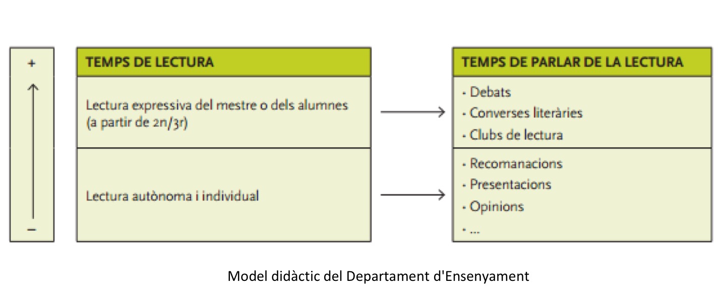 “El Departament d’Ensenyament (…) elabora un model didàctic per distribuir el temps de lectura (…) [que] recomana que el temps diari que es dedica a la lectura es distribueixi en dues activitats diferenciades: un temps per llegir i un temps per parlar del que s’ha llegit”.
