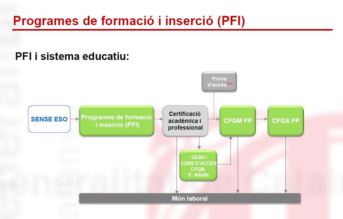 - Fer un PQPI (Programa de Qualificació Professional Inicial). Si es superen tots els mòduls del Programa (Obligatòris:A – B i Voluntàri: C) s’obté també el títol de Graduat en ESO. Fins els 21 anys.