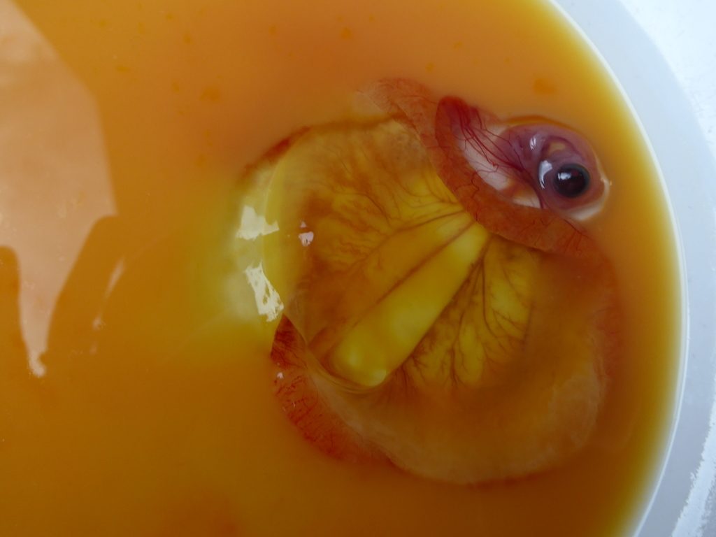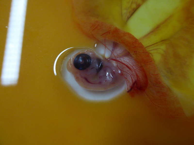 A dins de l’ou es podia observar el seu ull, els sacs aeris i les seves minúscules potes. A la closca de l’ou es podia observar la cambra d’aire que havia crescut si la comparem amb la de l’ou que ja havíem obert.