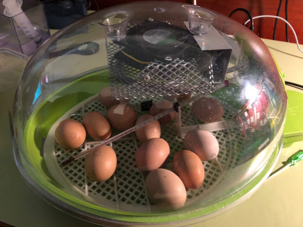 Ahir, quan vam girar els ous, vam veure que la temperatura no era correcta. La part de dalt estava molt calenta i la part de baix més freda i va resultar que el ventilador no funcionava i fer això la temperatura era diferent a cada part. Avui se’ns ha espatllat definitivament. A part del ventilador, aquest matí a deixat de donar calor.