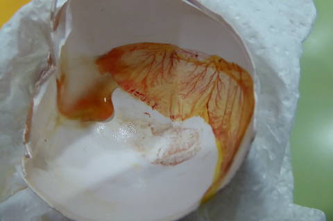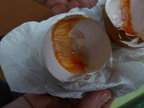 Quan vam obrir l’ou de la incubadora primer només va caure la clara i el rovell. Després ens vam adonar de que l’embrió s’havia quedat enganxat a la part interior de la closca. Estem una mica preocupats i preocupades ja que no sabem si allò era bo o dolent i hem començat a mirar si durant el cap de setmana els ous s’han girat bé. Finalment hem pogut comprovar que el motor de la incubadora funciona correctament, haurem de seguir investigant.