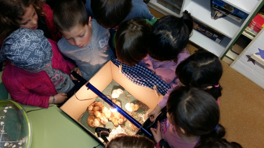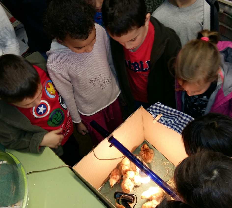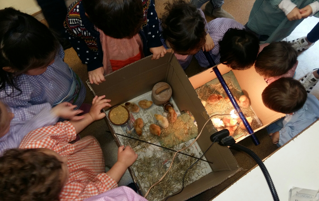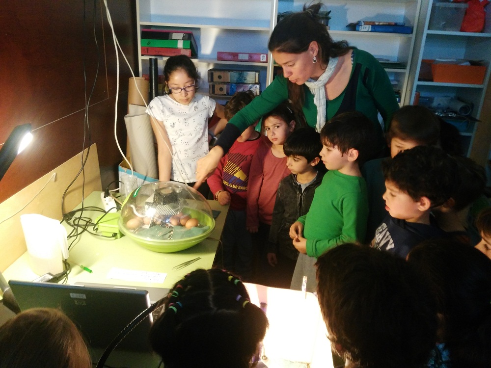 Els nens i nenes de l’escola venen a l’interaula de 5è per conèixer els pollets.