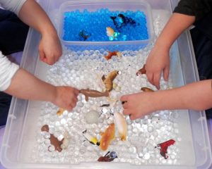 Aquesta setmana, a l’estona d’ambients, hem pogut experimentar amb diferents materials utilitzant les taules sensorials: Gel, aigua, sal gruixuda, cotó fluix… per representar els espais freds on hi viuen animals del Pol Nord. I hem pogut fer trasvassaments amb els diferents estris.