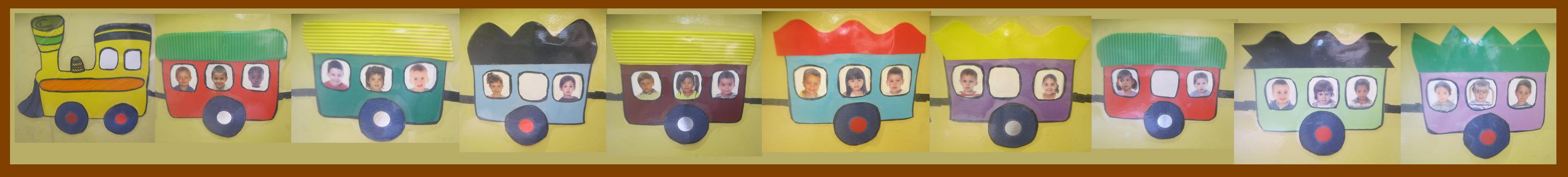 trens foto ← Previous Next → Davant de la classe tenim un tren fet amb cartolina amb les fotos dels tots els infants de P3A: TRENS.