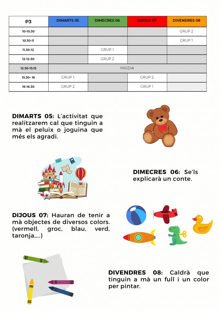 Ha passat l’estiu i comencem l’escola. Esperem que hagueu descansat i compartit moltes estones amb la vostra família. Us donem la benvinguda a l’escola i al curs de P-3, ja veureu com els nens i les nenes aprendran moltes coses durant tot el curs i s’ho passaran molt bé.
